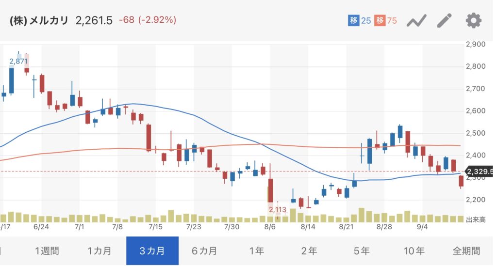 そんなお気に入りの銘柄であるメルカリなのですが、最近調子が良くありません。